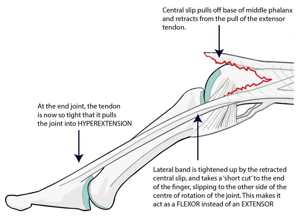 The central slip can injured with either a CLOSED mechanism (no skin wound) or with an OPEN mechanism (an associated skin wound). The central slip can also be injured as a result of a FRACTURE DISLOCATION of the knuckle joint.