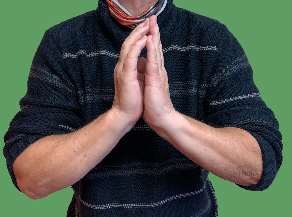 Diabetic cheiroarthropathy translates roughly as ‘stiff joints‘, and this is exactly what happens! It is again related to structural changes in the collagen of the soft tissues, and is more common in longstanding diabetes. In its early stages, many patients do not notice the loss of full extension and inability to bring the hands together in a prayer posture (see below). As is develops, the flexion contractures of the small joints prevent the hands from opening fully, and eventually the process also affects the ability to bring the hands into a fist.