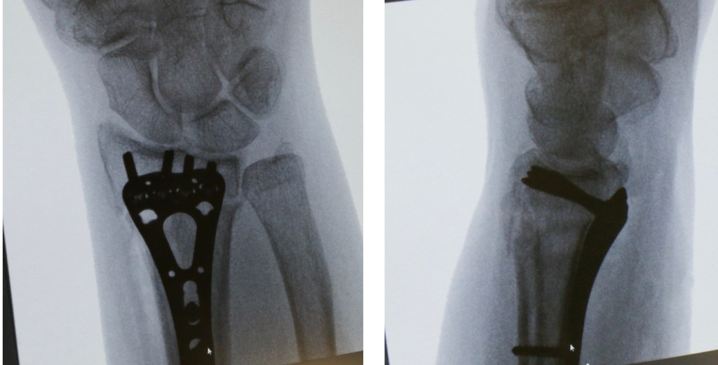 – An operation. At operation, the surgeon will again manipulate the bones back into position and fix them there with either some wires (these wires are a bit like barbeque skewers – they are relatively stiff with a pointed end to drill into the bone), or a plate. If a bone plate is used, a wound is made over the palm side of the wrist, and the plate inserted under the muscles and tendons.