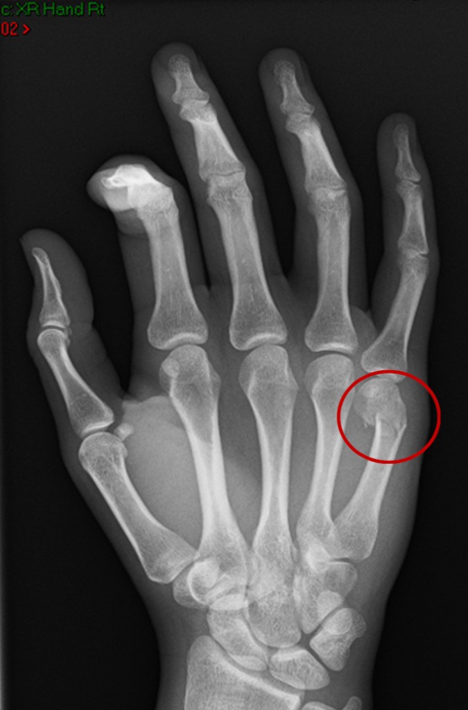 A fracture of the metacarpal ALMOST ALWAYS results in loss of the knuckle, or a dropped knuckle. This looks obvious when the hand is brought down into a fist, and there is a lump over the back of the hand at the level of the broken bone. This is called a malunion.