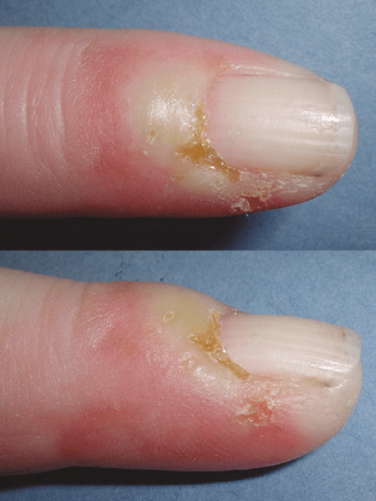 The nail and nailbed (Paronychia) – this is an infection involving the tissues around the edges of the fingernail. This is usually a result of nail injury from cutting or biting the nails.