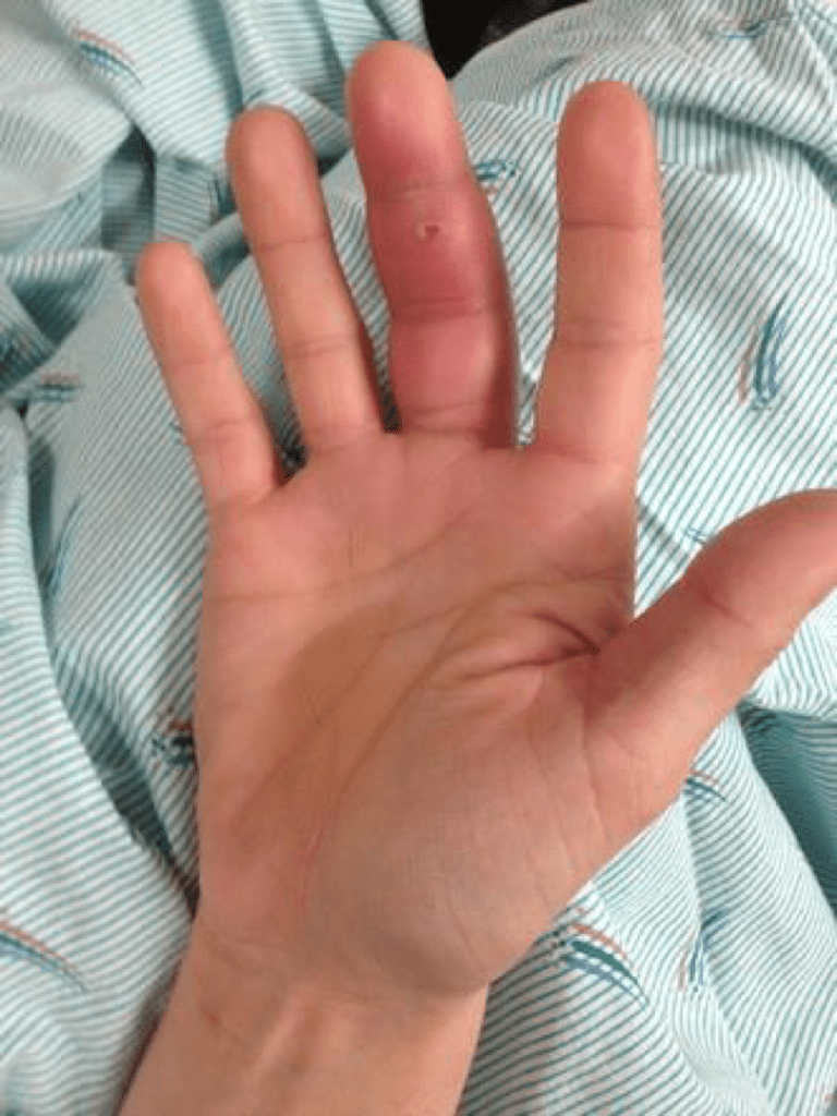The fingertip (Felon) – this is an abscess of the pulp of the fingertip. This is often caused by a penetrating injury to the fingertip. The pulp contains multiple small spaces within it and causes a build-up of fluid and pressure. This can cause problems with the blood supply resulting in problems with the skin of the fingertip. Rarely can this infection affect the underlying bone.