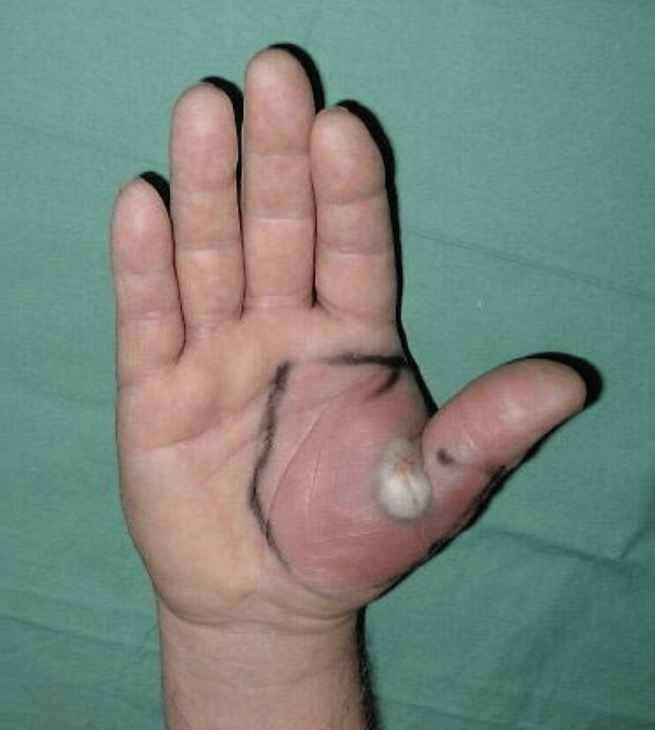 The palm (Deep Space Infections) – There are open spaces in the hand where there is no muscles, tendons or bone. These spaces can become infected, usually from a penetrating injury and are known as deep space infections.