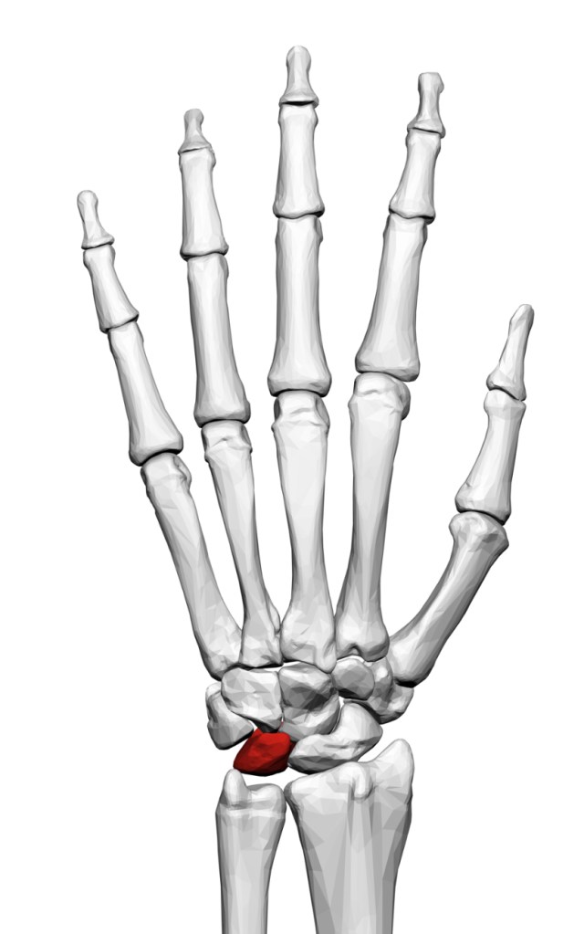 The lunate bone is one of 8 bones which make up the wrist joint, and is situated right at the centre of the wrist.