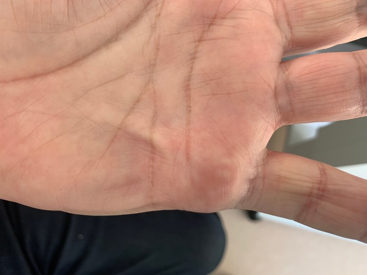 Early Dupuytrens disease can present with a lump within the palm of the hand. This is usually painless and does not require any treatment. They can feel slightly tender when gripping objects, such as a steering wheel. This tenderness does settle with time. If the Dupuytrens disease progresses, the fingers may begin to curl into the palm of the hand. See our information leaflet on Dupuytrens disease.