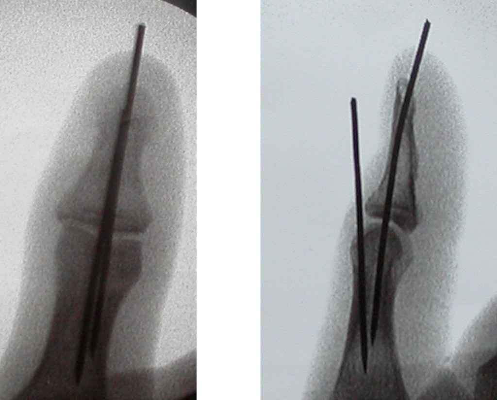 An UNSTABLE mallet injury is usually treated with an operation, and wires used to fix the bone in position. This may also be necessary if the injury is associated with a deep cut. The wires are removed at around 6 weeks, and by this stage, the bone has healed and the injury now stable. The rest of the hand can mobilise normally during the first 6 weeks, and the injured joint mobilised immediately following removal of the wires.