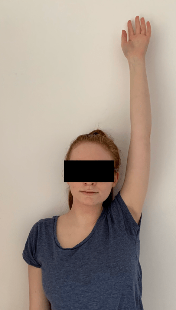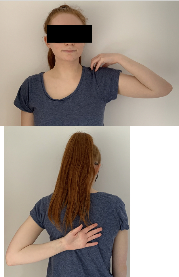 Straighten your elbow out fully, then bend it up and touch your shoulder with your fingers – or as near to your shoulder as you can.
