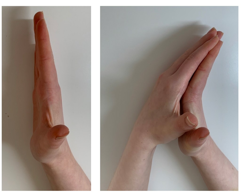 Bring your fingers into a position where the base joints remain extended and the finger joints flexed. Secondly, reverse this position so that the base joints are flexed and the finger joints extended.