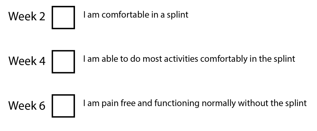 • By four weeks, the swelling should have gone down, and the splint should no longer be required except for periods of heavy activity.