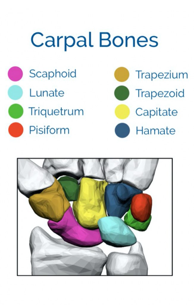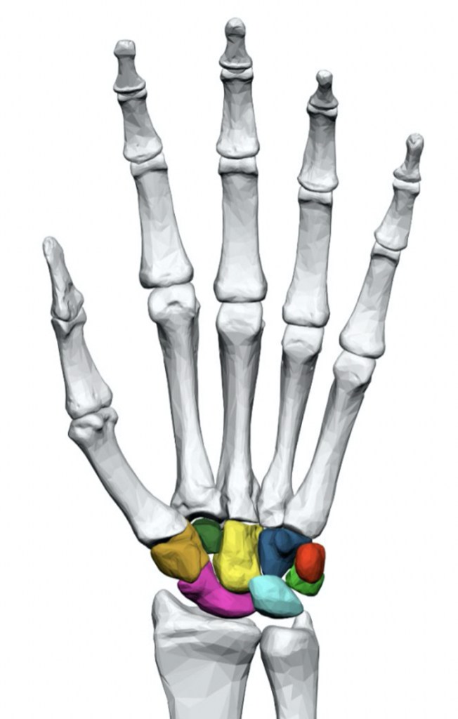 The wrist is the most complex joint in the body. It is made up of eight small bones (carpal bones) and many ligaments, all arranged in a manner to allow a large range of motion.
